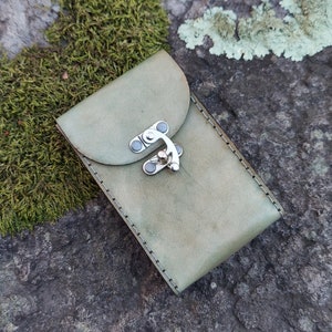 This case comes with a heavy antique brass clasp. There is a thumb slot cut out that is hidden under the front flap to allow for easy retrieval of your tarot cards. Hand sewn (saddle stitched to avoid any unraveling) with emerald green thread that keeps all seems super tight.