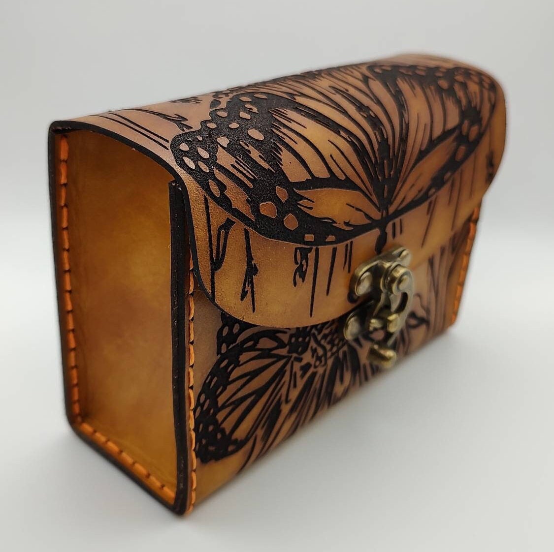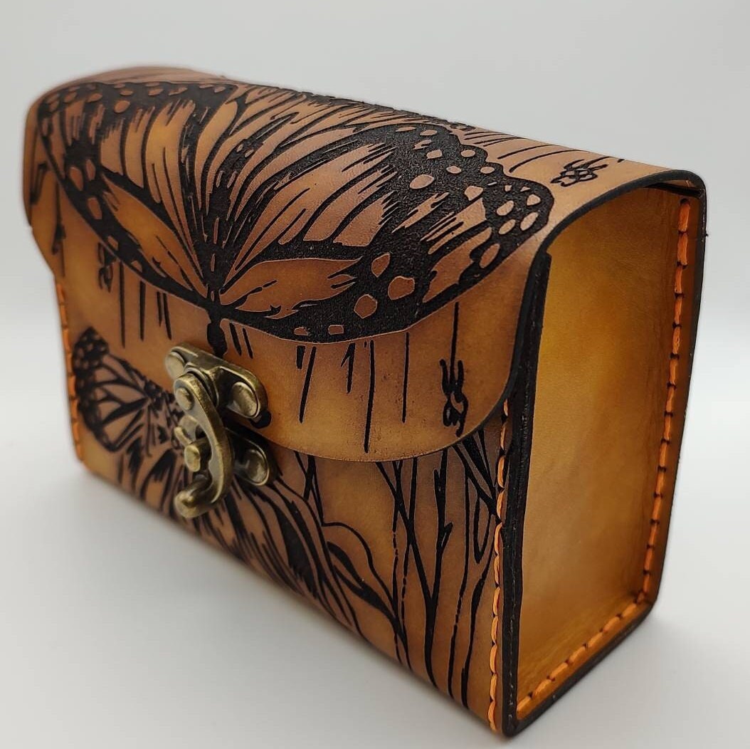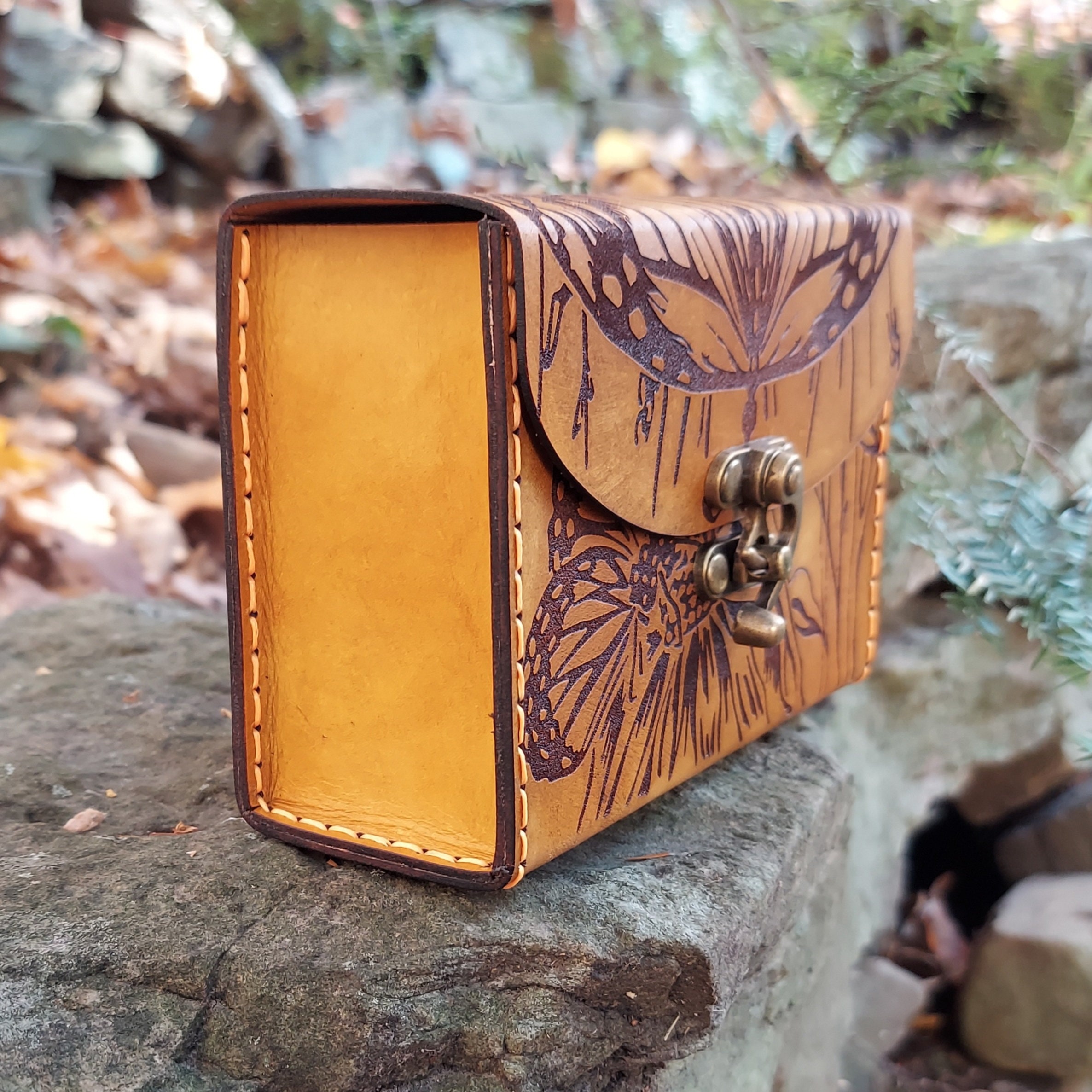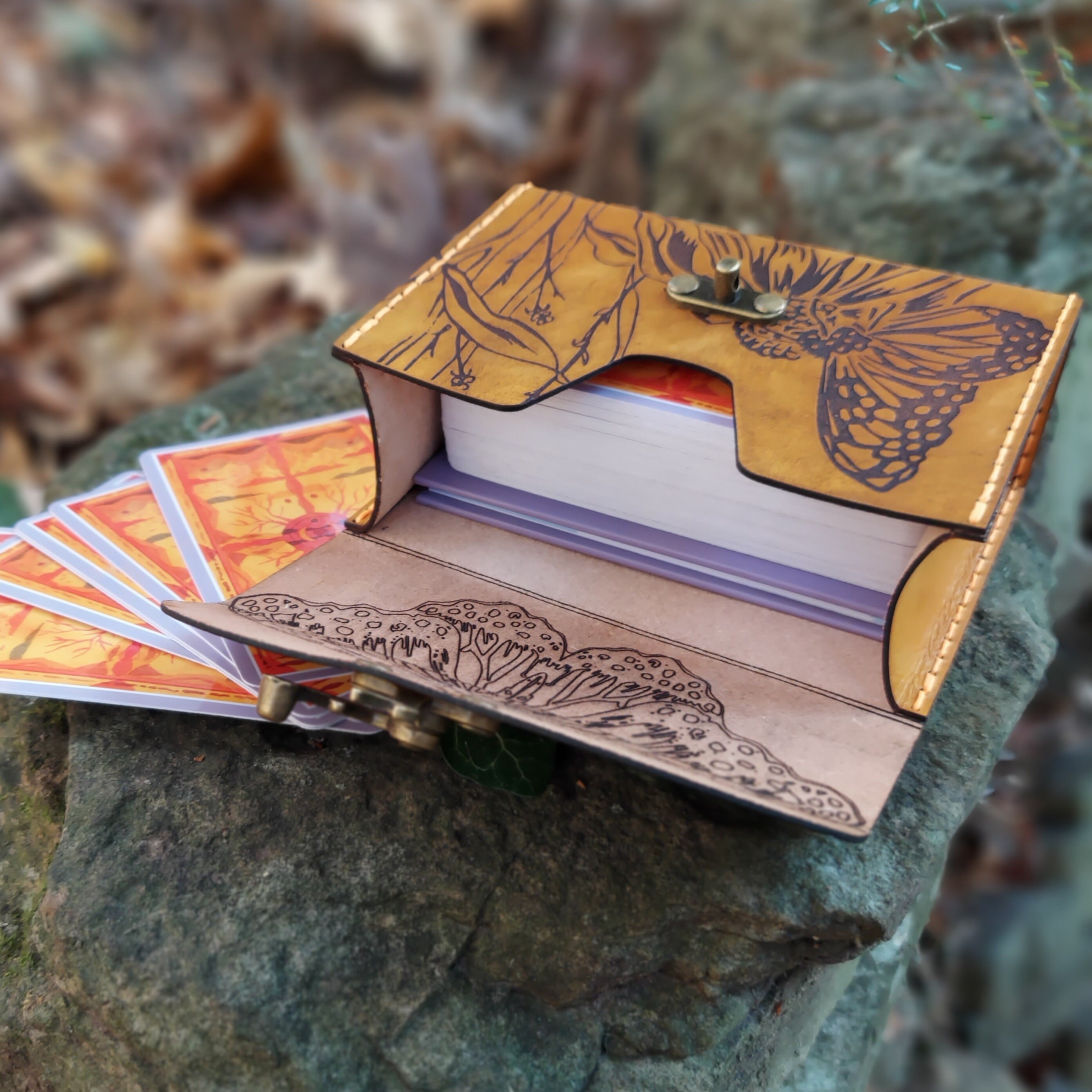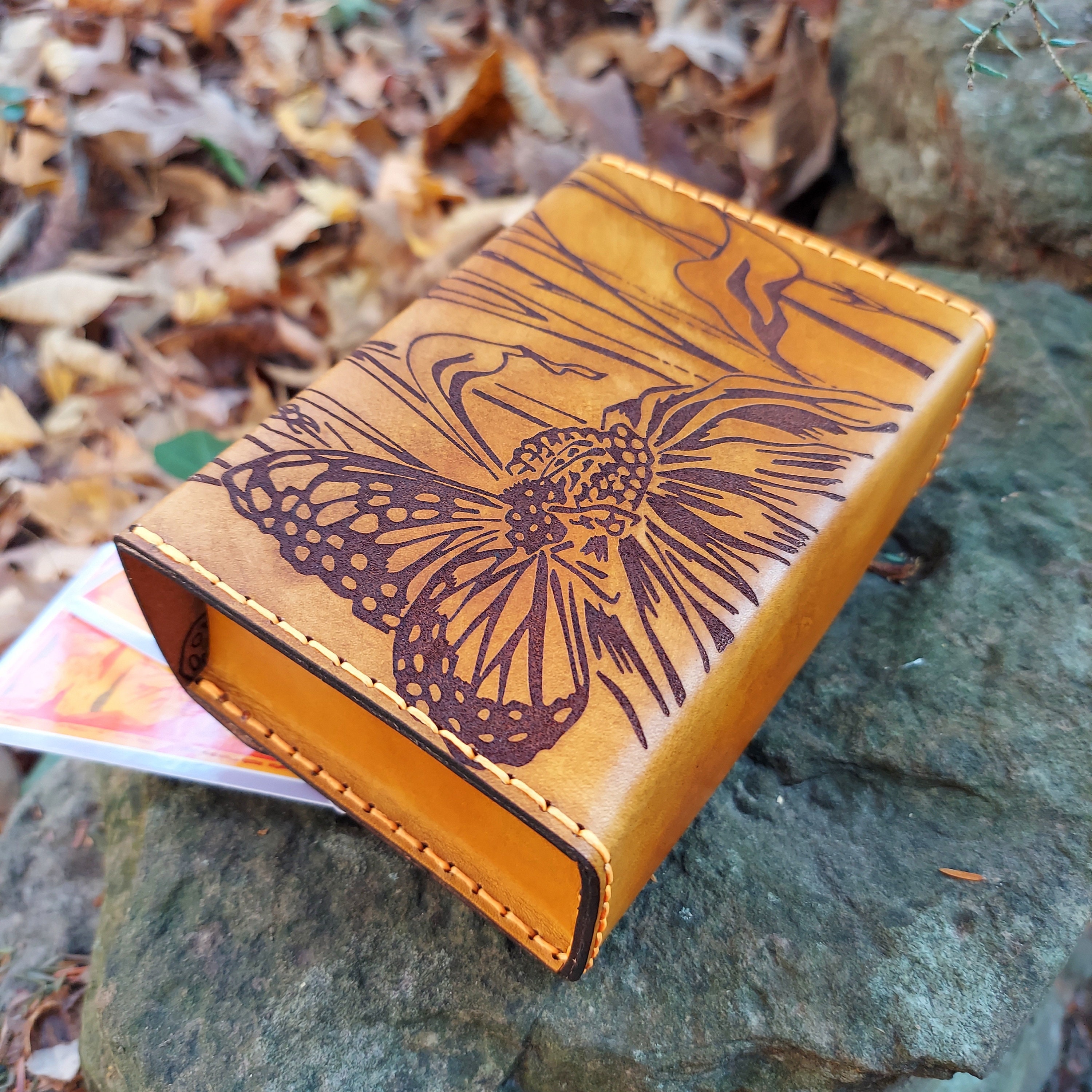 This Premium Leather Tarot Card Case is a handmade large leather tarot box for oversized tarot decks. It's been hand dyed with in shades of Golden Tan for a unique distressed or vintage look. The original hand drawn art featuring butterflies and flowers has been permanently engraved into the leather. The case is side loading and will accommodate slightly larger decks and guidebooks. This nature themed case is a special way to protect and carry your own favorite deck or would make a thoughtful gift.