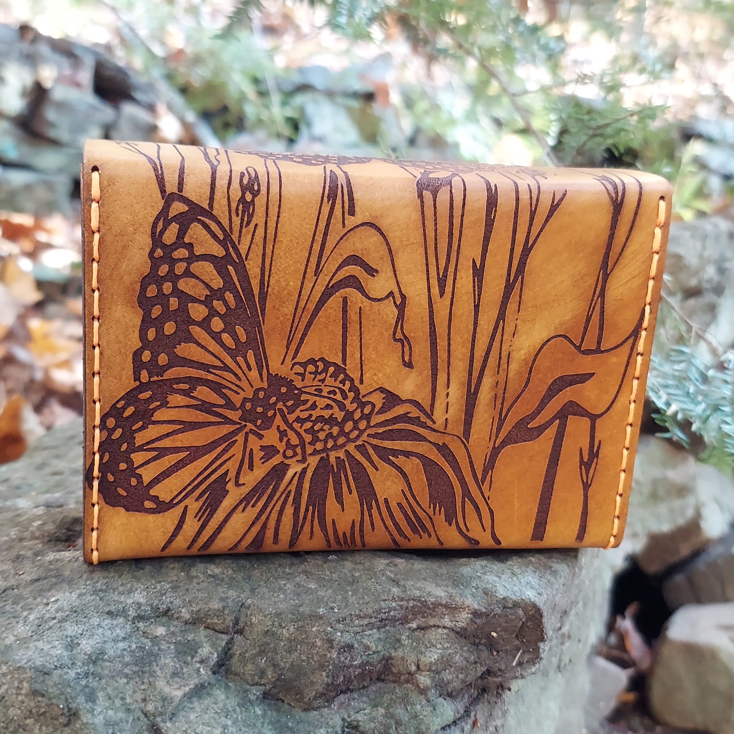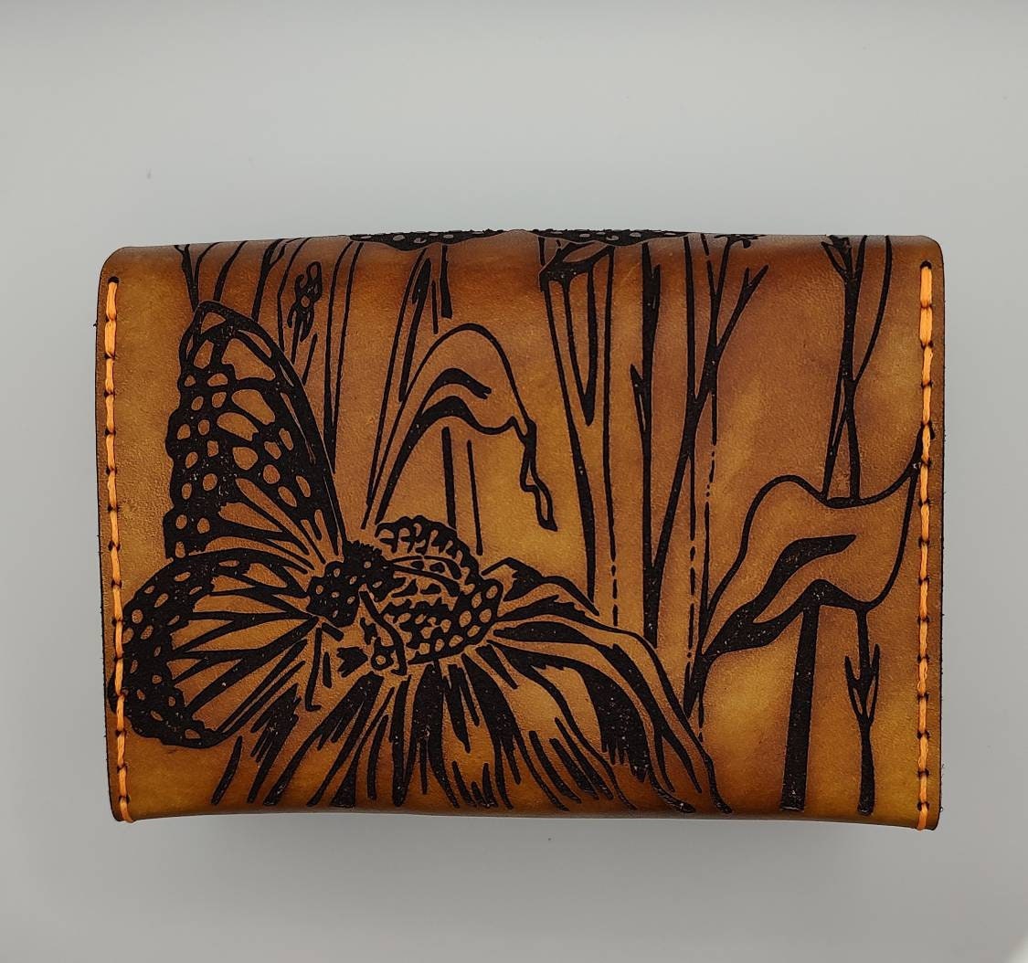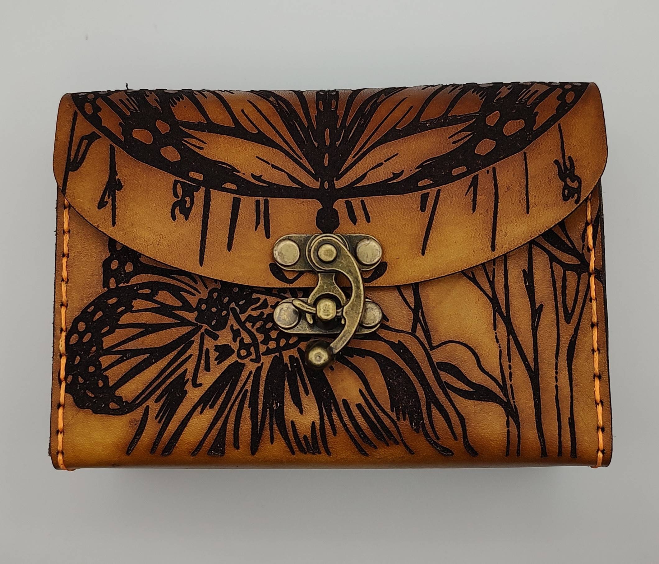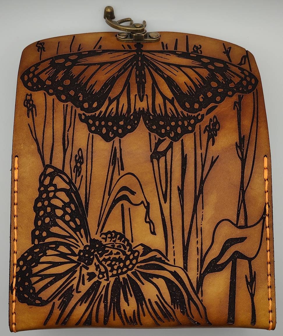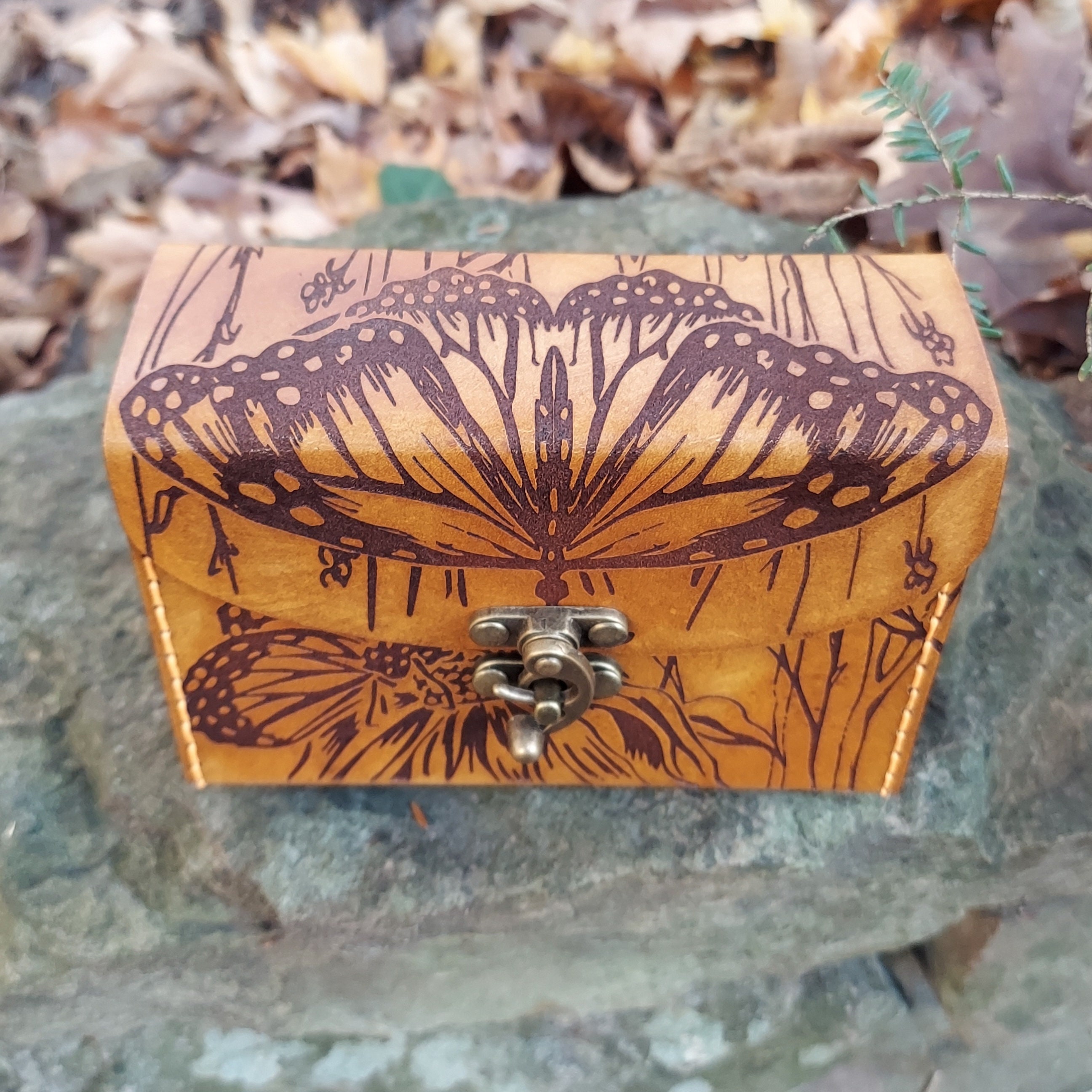 This Premium Leather Tarot Card Case is a handmade large leather tarot box for oversized tarot decks. It's been hand dyed with in shades of Golden Tan for a unique distressed or vintage look. The original hand drawn art featuring butterflies and flowers has been permanently engraved into the leather. The case is side loading and will accommodate slightly larger decks and guidebooks. This nature themed case is a special way to protect and carry your own favorite deck or would make a thoughtful gift.
