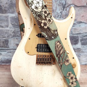 This guitar strap would be an amazingly thoughtful gift for a guitar or bass player, particularly those who enjoy peonies or the unique vintage look. The sturdy vegetable tanned leather and width make it suitable for all types of guitars, from a light acoustic to an electric guitar or bass. It feels good on the shoulder and looks incredible.