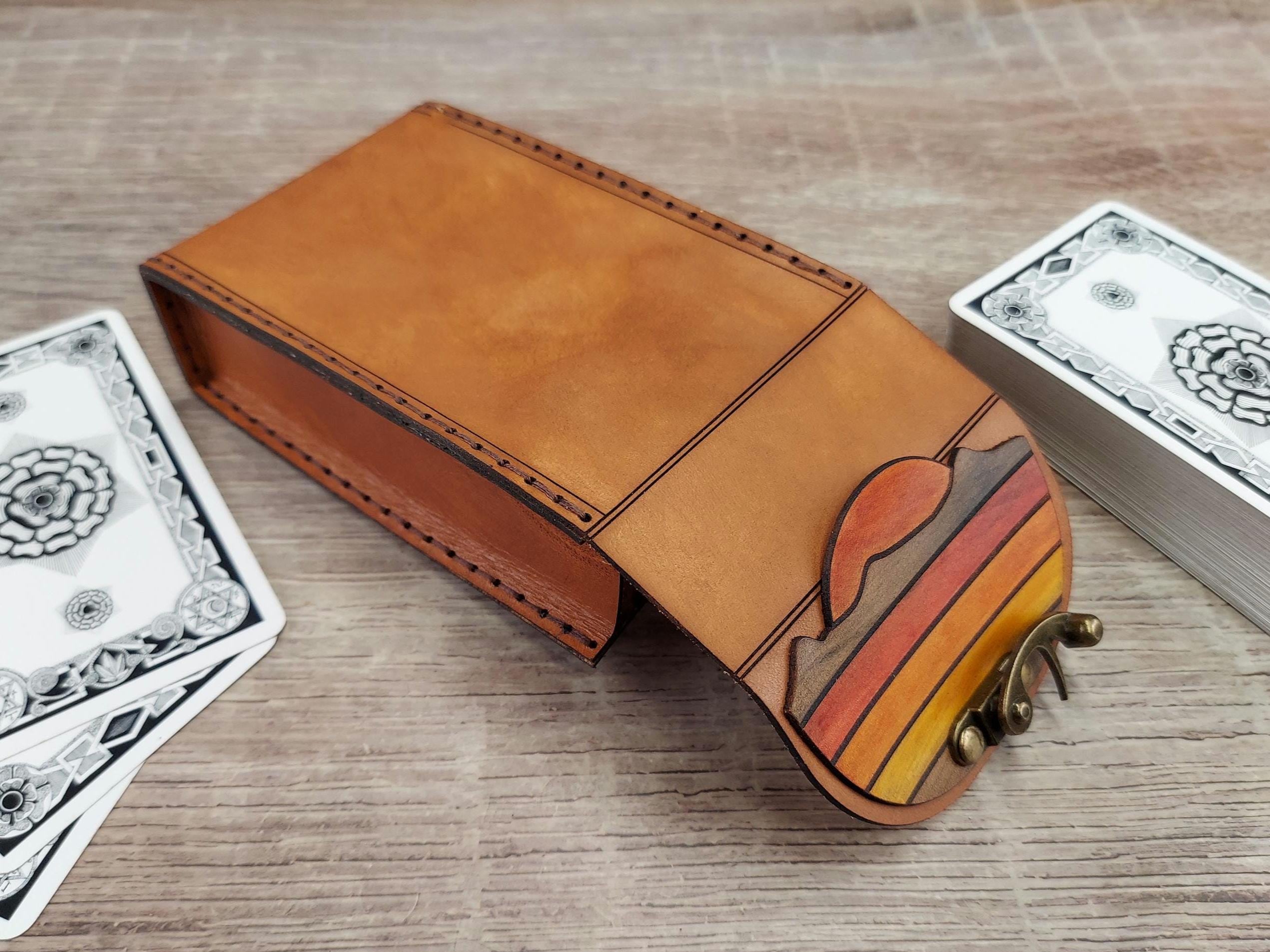 All our standard size tarot cases are tested at the time of creation and prior to shipping, using a classic RW deck from a US publisher. We also have listings in our shop for palm sized (slightly smaller) or oversized decks. If you need a larger case to fit your specific deck, I would be happy to custom build one for you. Please feel free to message me with your ideas and deck measurements.